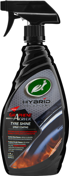 Turtle Wax HS Graphene Acrylic Tire Shine tar fram en djup och mörk glans på däcksidorna samt ger en extrem hållbarhet, avrinning- & UV-skydd. Syntetiska glanspolymerer ger en justerbar djup svärta och glans, samt förhindrar att däcket blir brunfärgat. En coating som stöter bort vatten och smuts i månader!