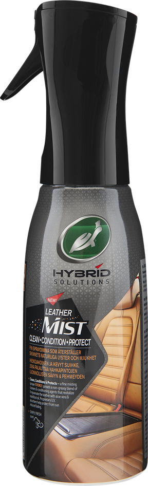 Turtle Wax Hybrid Solutions Mist Leather Conditioner & Cleaner en mycket finsprayande och rengörande produkt för allt skin i bilen. Den sprider ut medlet jämnt över ytan för enklare rengöring av alla skinkvaliteter. Den både rengör och skyddar och efterlämnar en ren och slät yta med hjälp av en pH balanserad blandning av Neatsfoot Oil, kakaofett, vitamin E och aleo vera.